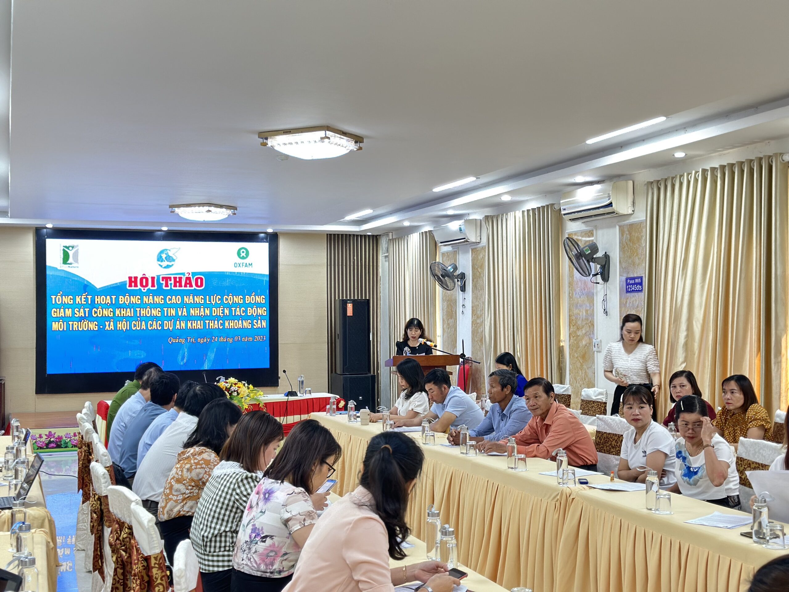 Tại hội thảo, đại diện Hội Liên hiệp Phụ nữ tỉnh Quảng Trị có bài trình bày về các hoạt động trong dự án và kết quả sau 1 năm thực hiện dự án. Theo đó, các hoạt động đã đạt được mục tiêu lớn nhất là nâng cao năng lực cho cộng đồng về chính sách pháp luật liên quan tới khai khoáng, bảo vệ môi trường và phần nào thông tin tới các cơ quan quản lý, doanh nghiệp về những ý kiến của người dân đối với hoạt động khai thác khoáng sản trên địa bàn. Hội Liên hiệp Phụ nữ tỉnh Quảng Trị đề xuất PanNature tiếp tục phối hợp với đơn vị trong các hoạt động sắp tới để mở rộng nhóm cộng đồng hưởng lợi hơn nữa.