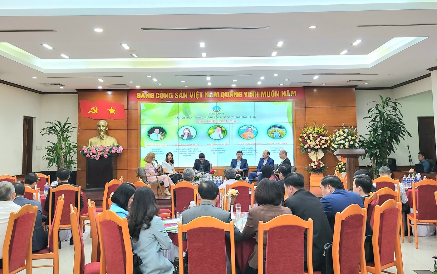 Các diễn giả tham gia toạ đàm, ông Trần Quang Bảo – Cục trưởng Cục Lâm nghiệp, ông Cao Văn Cường – Giám đốc Sở Nông nghiệp và Phát triển nông thôn tỉnh Thanh Hoá, bà Đỗ Thị Thanh Huyền – Nhà sáng lập, Giám đốc điều hành Trung tâm bảo tồn thiên nhiên GAIA, bà Ngô Nữ Huyền Trang – Trưởng phòng đối ngoại phụ trách phát triển bền vững Công ty Suntory PepsiCo Việt Nam, ông Hà Đăng Chỉnh – Trưởng phòng nguyên liệu gỗ Công ty CP Woodsland đã đưa ra các nhận định, quan điểm liên quan đến công tác xã hội hoá trồng rừng, động lực để các thành phần kinh tế trong và ngoài nhà nước, các tổ chức xã hội tích cực tham gia đầu tư trồng rừng cũng như những khó khăn, thách thức đối với việc huy động nhiều thành phần kinh tế cùng tham gia hoạt động trồng rừng, kinh doanh rừng, đặc biệt là trồng rừng gỗ lớn và rừng có chứng chỉ quản lý bền vững, phát huy các giá trị đa dụng của rừng,…