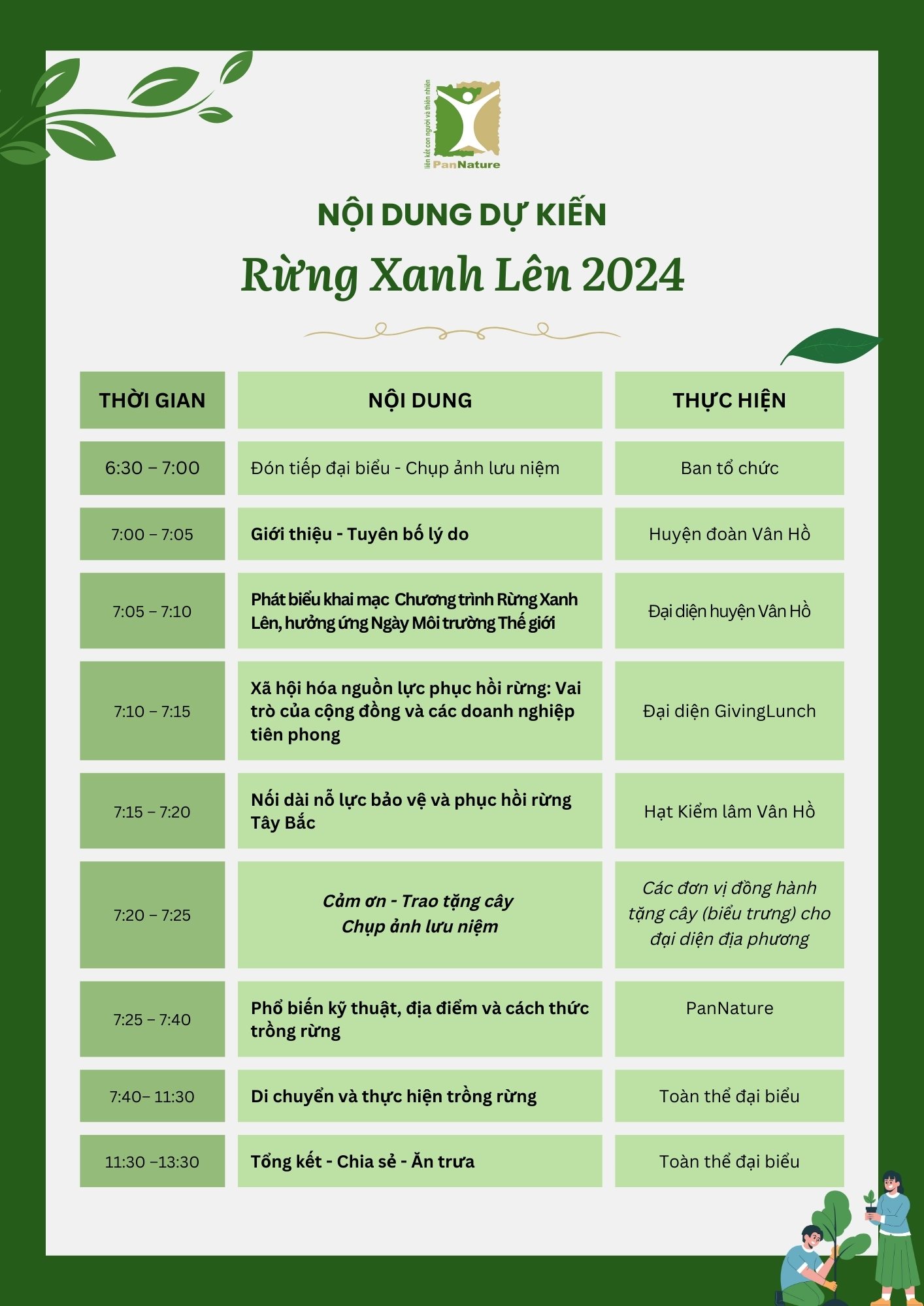 Tiếp tục chặng đường phục hồi màu xanh cho những cánh rừng với sự kiện Ngày Môi trường Ta đi trồng cây năm 2022 và Vá rừng trên núi đá năm 2023, hưởng ứng Ngày Môi trường Thế giới 5/6/2024 với chủ đề: “Phục hồi đất, chống hạn hán và sa mạc hoá” (Land restoration, desertification and drought resilience), PanNature phối hợp với Hạt Kiểm lâm Vân Hồ, Huyện đoàn Vân Hồ và UBND xã Vân Hồ tổ chức Chương trình Rừng Xanh Lên 2024 nhằm phục hồi 25 ha rừng tự nhiên trên hành lang núi đá nối giữa Hòa Bình và Sơn La – ngôi nhà chung của loài Vượn đen má trắng nguy cấp quý hiếm cùng nhiều loài động thực vật hoang dã khác. Sinh sống quanh khu vực rừng là các cộng đồng người dân tộc Mông với nhiều nét văn hóa độc đáo.