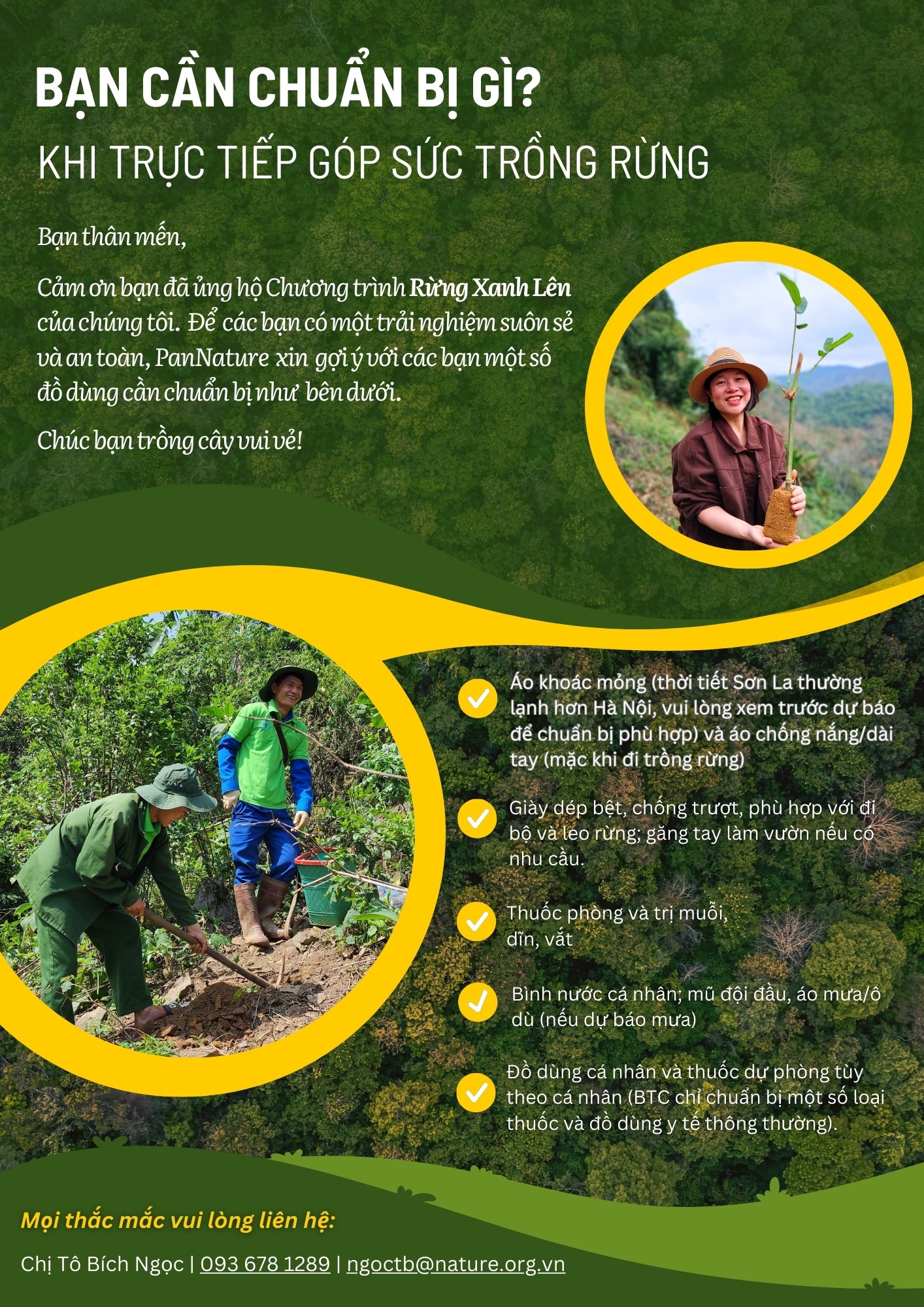 | Lưu ý: Chương trình được tổ chức với quy mô lớn, vì vậy Quý anh chị vui lòng chủ động việc ăn nghỉ – đi lại khi tham gia hoạt động. PanNature sẽ hỗ trợ cung cấp thông tin về các dịch vụ tại địa phương tới những anh chị có nhu cầu. |
