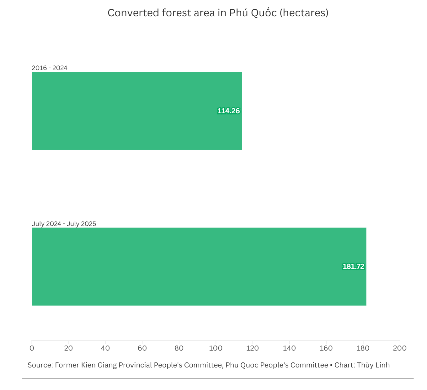 Looking specifically at special-use forests, the 141 hectares (348 acres) converted in Phu Quoc in the year following Decree 91’s issuance, amounts to nearly four times the area converted from 2016 to 2024 (38.6 hectares, 95.4 acres).