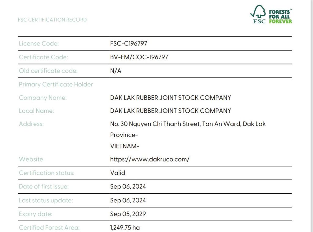 In the Central Highlands of Vietnam, rubber plantations stretch across the landscape, a vital part of the local economy. For years, these plantations faced the challenge of balancing economic growth with environmental responsibility. This year, a significant step forward was taken: Dak Lak Rubber One Member Limited Liability Company (Dakruco) achieved FSC FM (Forest Management) and FSC CoC (Chain of Custody) certifications from the Forest Stewardship Council (FSC) for over 1,100 hectares of rubber forest.